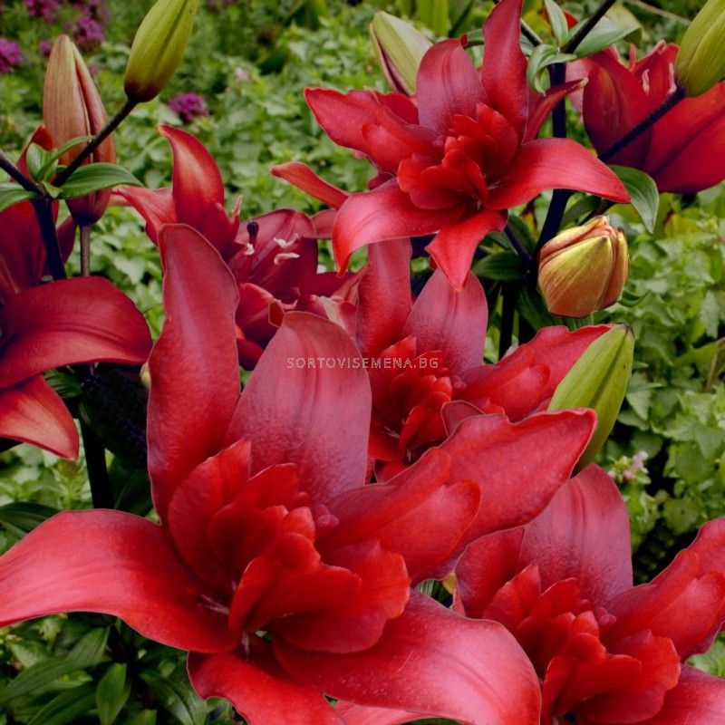 Тъмночервен, двоен азиатски лилиум. Твърди стъбла и цветове без мирис.